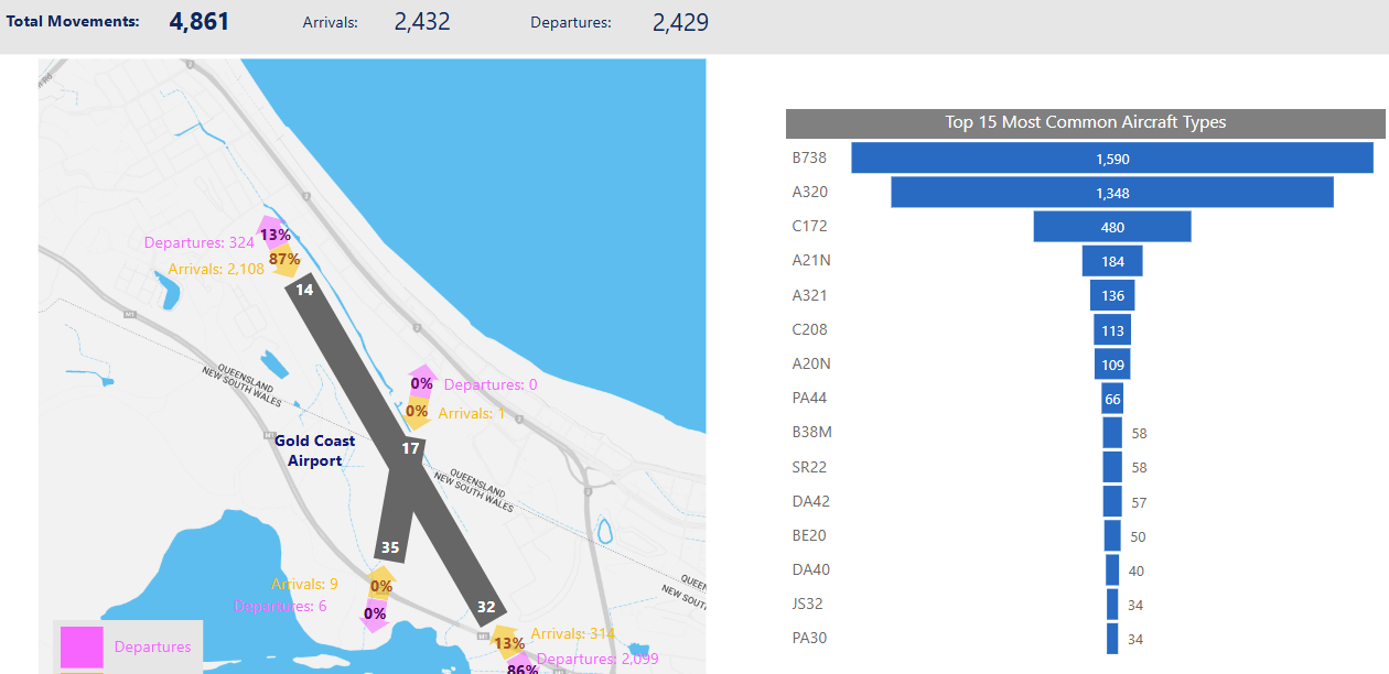 The overview below provides monthly movement numbers, runway end usage, and the types of aircraft operating at Gold Coast airport.
